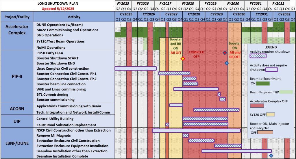 The long-term Accelerator Operations Plan indicates the scheduled beam delivery for the current accelerator complex supporting the ongoing experimental program and the planned integration of PIP-II and the LBNF/DUNE beam with the complex. The plan also includes the timeline for upgrades to the complex and associated infrastructure systems, ACORN and UIP. A major shutdown of the complex (long shutdown) is scheduled for 2028-2029.