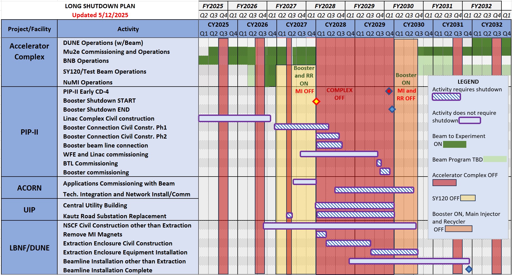 The long-term Accelerator Operations Plan indicates the scheduled beam delivery for the current accelerator complex supporting the ongoing experimental program and the planned integration of PIP-II and the LBNF/DUNE beam with the complex. The plan also includes the timeline for upgrades to the complex and associated infrastructure systems, ACORN and UIP. A major shutdown of the complex (long shutdown) is scheduled for 2028-2029.